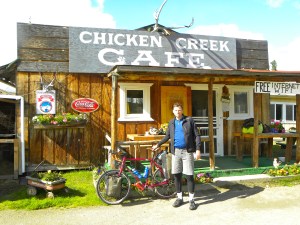 Day 20 (17 miles) (‘49 mile’ Campsite to Chicken): Tough little stretch of rolling hills and arrived at Chicken. Had the 1/3 pound buffalo burger and spent the rest of the day in the Chicken Creek Bar drinking Amber ales and talking to the owner, or more precisely the owner talking to me as when Susan holds court in her place, her word is law. You got to be tough to survive up her and the locals have this self reliant certitude about them. The tour buses cruise through for souvenirs – anything with ‘Chicken written on it. Later in the day the old gold miners and the camper tourists fill up the bar and a couple of guitar players emerge to put down the Dixie Chicks tunes. The owner’s daughter is back from university where she has an ice hockey scholarship. “Your legs must be hard” says she (the saucy little darling). Your correspondent: “Indeed, hard and getting harder” (Susan the owner/mother would no doubt sever my manhood). Later in the evening the manners are slipping in the bar as the camper-van girls get a few on board and the panty gun (a paint ball gun adapted for purpose), is fired off a few times. The remnant threads are hung on the trophy ceiling and walls. Your correspondent was of course tucked up in bed thinking pure thoughts and pondering how to cure all known diseases by that point. (If you are 18 or above go to www.buff3yinthebuff.com and pay your $14.95 for one month’s membership for alternate versions). It’s all happening in Chicken. Camped in a “walled tent” out the back of the shop that had a stove.