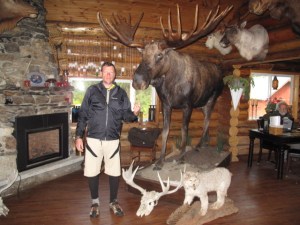 The Alaska-Canada (‘AlCan’) Highway as I understand it used to be imbued with romantic notions of serious northern adventure travel. Now it is a sealed modern and tamed national trunk road that conjures little but the desire to be done with it. That is why it was with some relish that I took a right turn off the AlCan just prior to Watson Lake and headed down the Cassiar Highway. Even more fortuitous was the timing in that the road has been cut by excessive rain (near Bob Quinn and Bell2) and resultant flooding which also washed a couple of bridges and verges away. I therefore had the road virtually to myself for much of the way apart from some local vehicles and a couple of trucks heading down to repair the road. The fainter hearted, faced with lengthy delays or being turned back might have been tempted to go back around and back onto the AlCan but not your hard-core intrepid correspondent. I battle southwards ever southwards come what may (“come hell or high water” literally). This highway is popular with cyclists so after having seen only three cyclists on the entire road from the top of Alaska, in the last two days I have seen seven. Am happy to report the belated sighting of bears. After much talk of bears (maybe too much talk) and bear avoidance and defense tactics, I actually saw a mother and two cubs. Came across a caribou and kid who were too stupid to run off the road so I chased them down the road for a good three kilometres. Then last night as an added bonus outside the lovely Tatoggo Lake ‘resort’ I also got to see the northern lights in a huge swathe across a clear sky. The good folk of the local hunting community here are full of rumours of highway closure and when it might open again but I will head south tomorrow and see what happens (such is the happy-go-lucky adventurer that I am).