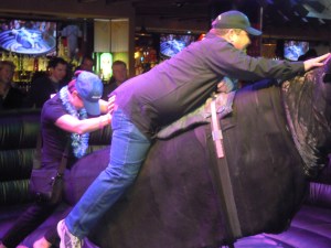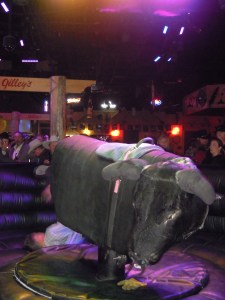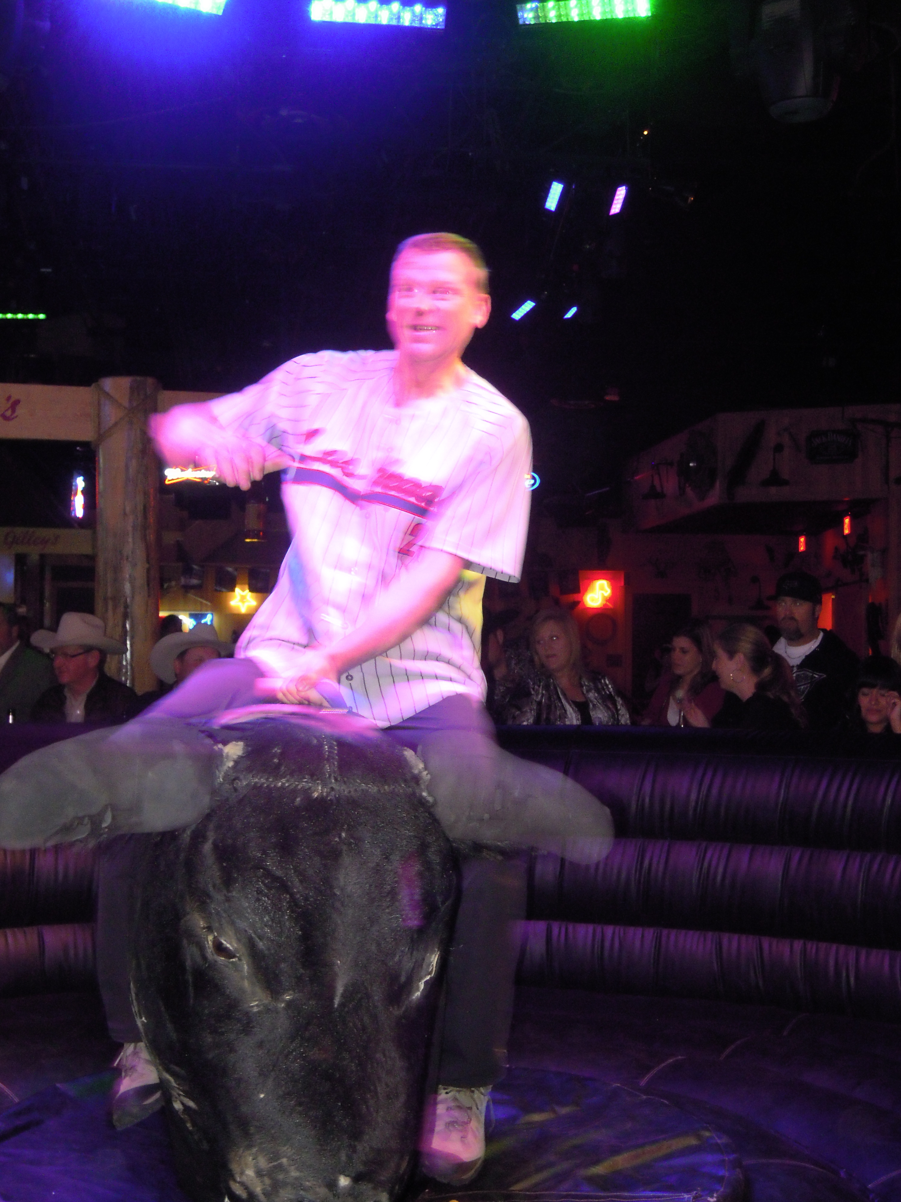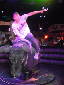 The National Rodeo Finals are on in town so of course it behooves your correspondent to go and spend some time rubbing chaparejos with the good ol’ boys and gals. Buff3ysbicyclingblog is always poised to perform all manner of daring stunt (refer photo) to keep my readership entertained so here is the latest offering; mechanical bull riding. Now don’t do this at home kids. You need years of preparation for this kind of stunt and at least a few days to recover. I think I may have put my hip out and then un- and re-strangulated a hernia or two. Don’t do this unless you are seriously hardcore! Please note the graceful back-flip on dismount. As students of the work of Tom Lehrer are no doubt aware, “There is surely nothing more beautiful in this world than the sight of a lone man facing single-handedly a half a tonne of (stuffed) angry pot roast!” He actually wrote this in relation to bullfighting but climbing onto one of these things must qualify as a feat of courage and stupidity equal to (stuffed) bullfighting. Square dancing (below) without your own matching black knickers and chaparejos is never a good look so this is best approached as a spectator sport.