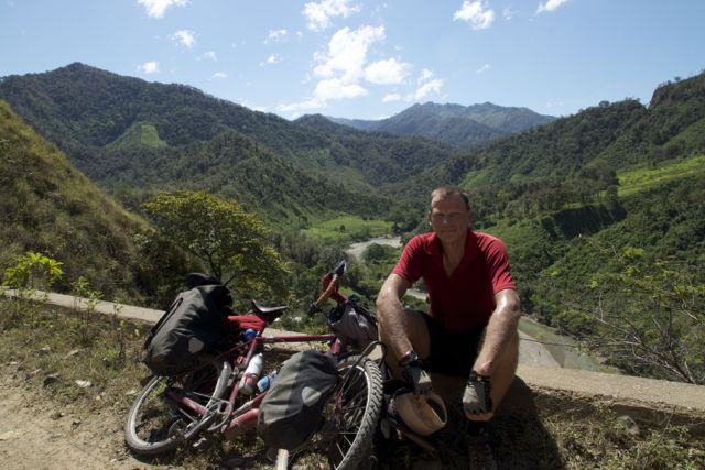 A pretty good dirt road with no traffic through a remote valley up to 1,100 metres. Big rise up through a beautiful valley next to a pretty river looping up to 1,100 metres twice more then cascading along the undulating corrugated dirt through the afternoon. La Union is a grubby dark sewer of a town. The fat slags at the L150 ($8) hotel have seemingly at some time used the mattress in my room and crushed the life out of it so it sadly sags.