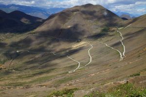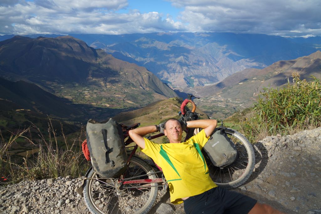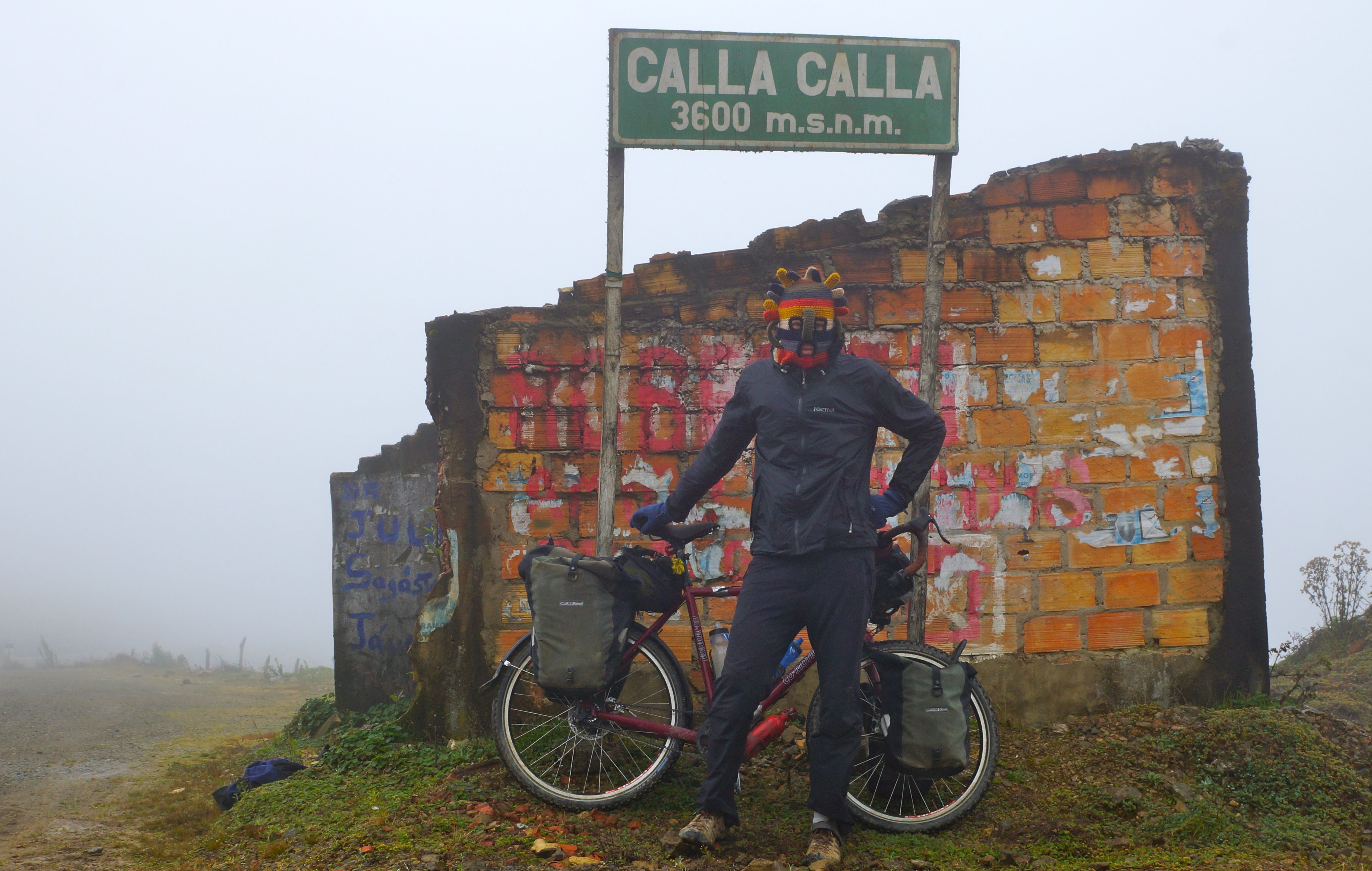 The valley between Leymebamba and Celendin (AKA ‘The Valley of Instant Death’) is two days of wonderful scenic riding. 29km from the very friendly town of Laymebamba (at 2,200m), the dirt road goes up and over the lip into the valley followed by a long rollicking plummet into the valley was an awe inspiring valley ride. At the pass at ‘Calla Calla’ (which means ‘Instant Death’ in the local dialect) at 3,600 metres, the rain and cloud are tearing across the road (refer photo and video), so the Cyberman/sun god mask is put to good use (refer photo). Some small kids see the mask and run which is odd given that there must have been Dr Who contact at some point in history as many people here still say, “Good Tardis”. From there it is just stunning scenery down to the river crossing at Chalas (870metres). The ride out of the Valley of Instant Death was truly stunning. Zig zagging for 2,200 metres up the valley slope where you can easily look down on the town below after 43km of riding.