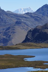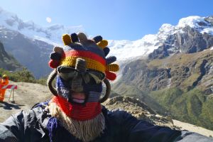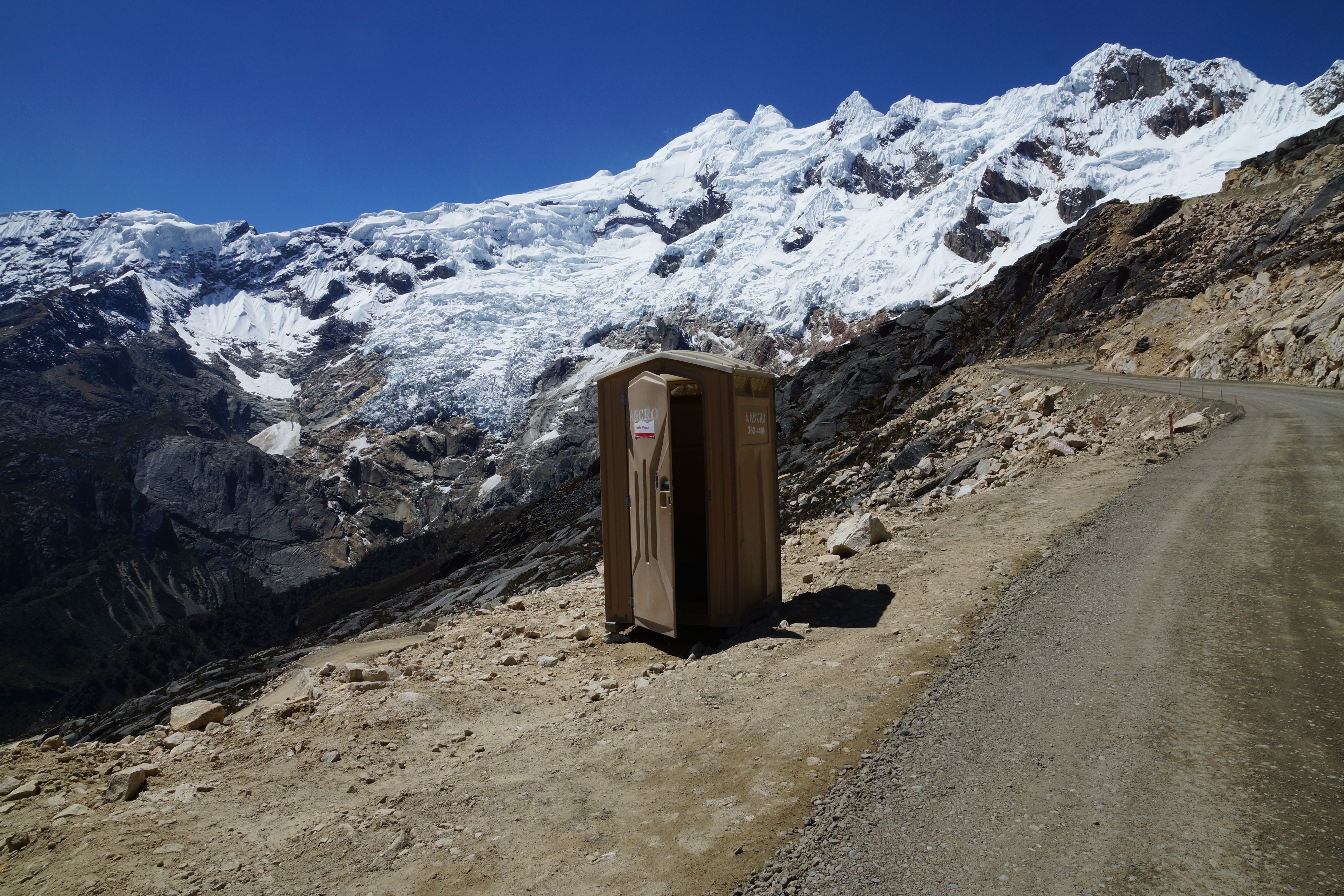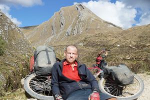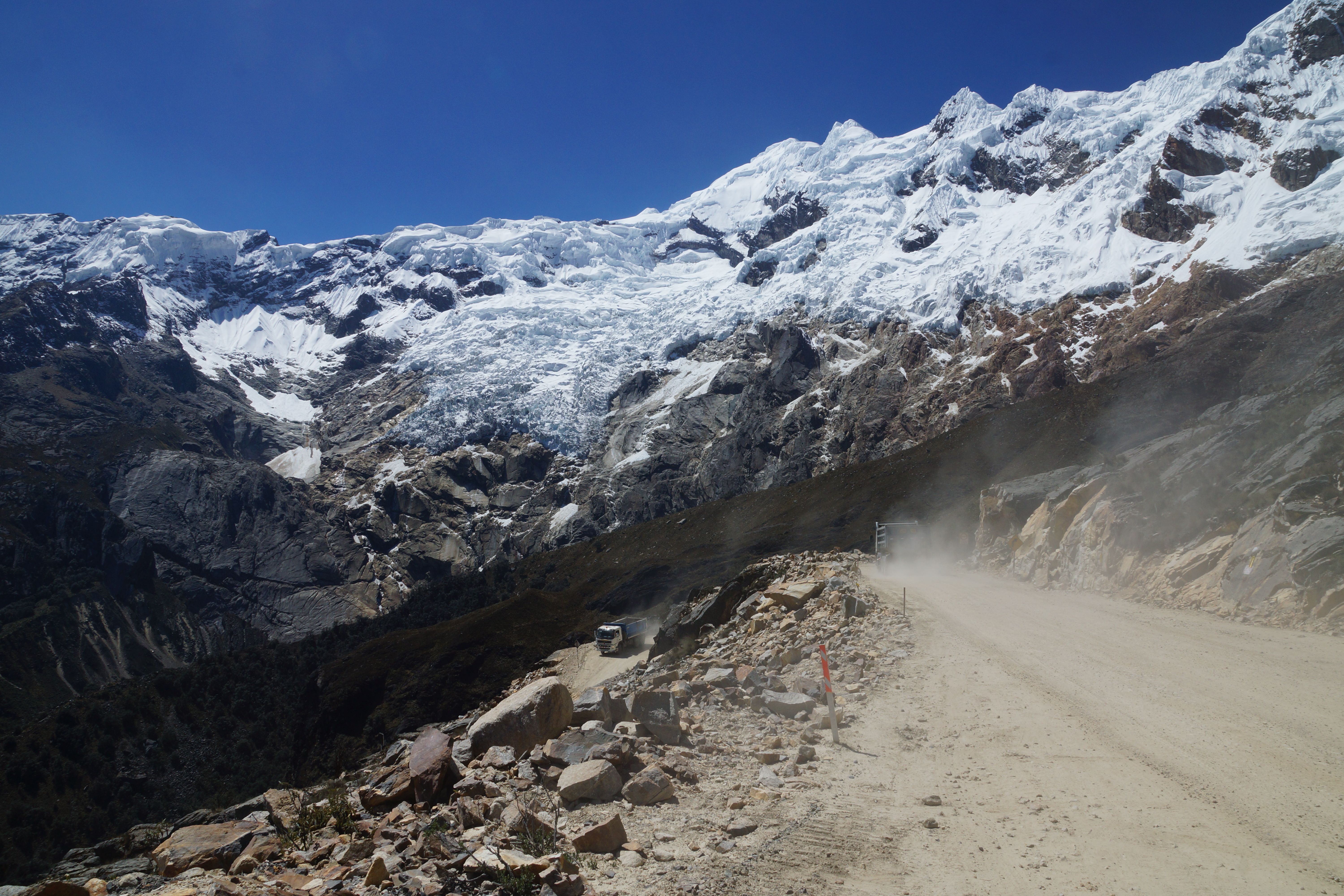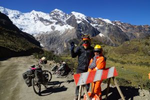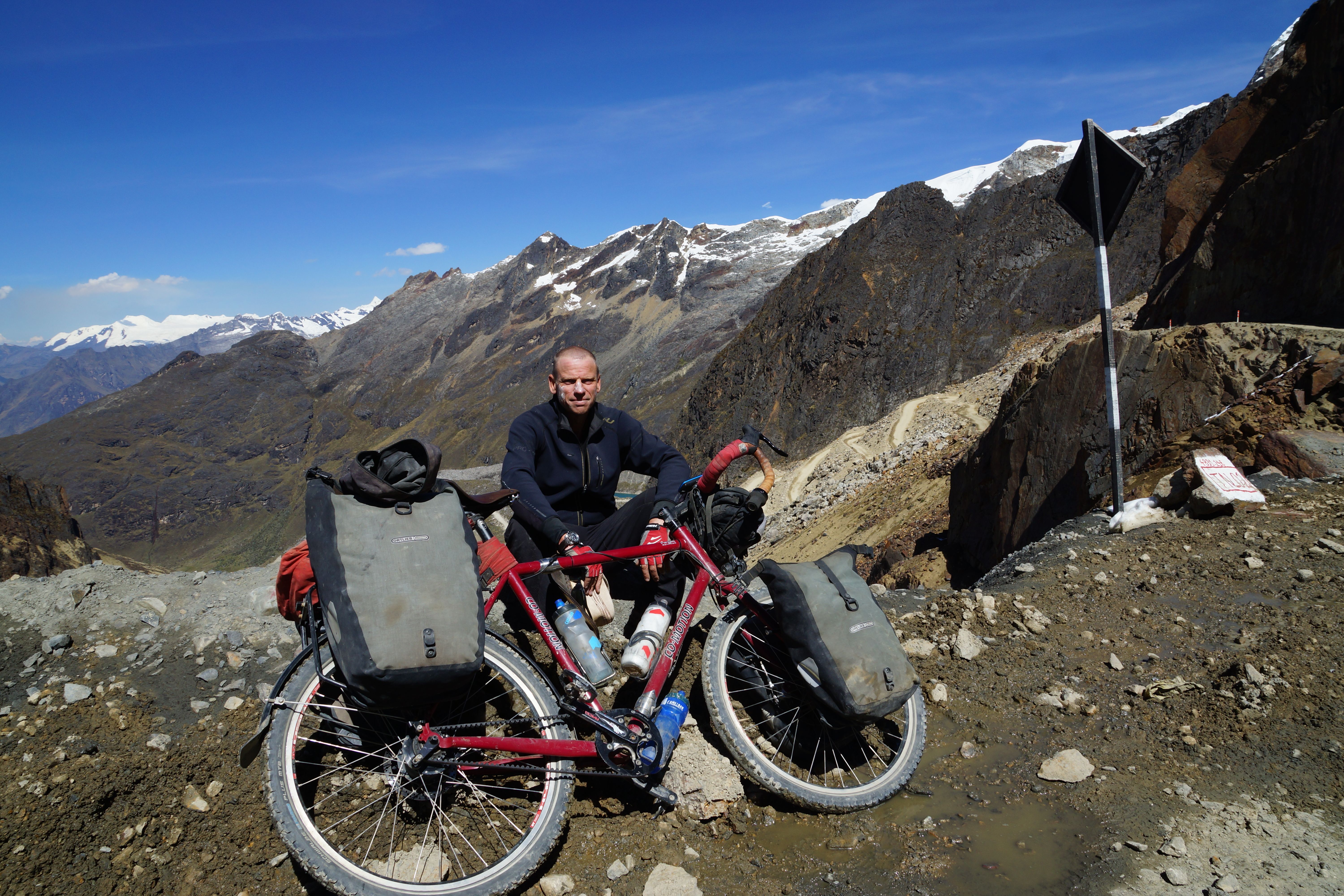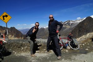 Well Peru has cranked up the volume on the scenery another few notches as the road cuts through the Huascaran National Park and the magnificent Cordillera Blanca mountain range. The ride across the range is one of the highlights of the Peru part of the trip and the Punta Olimpica Pass that crosses the range is a rare beauty with a long climb up to 4,950 metres and the twin glaciers near the summit. I set out up the pass with Jose and Corinne and then meet Eric again at the top of the pass (refer photo).