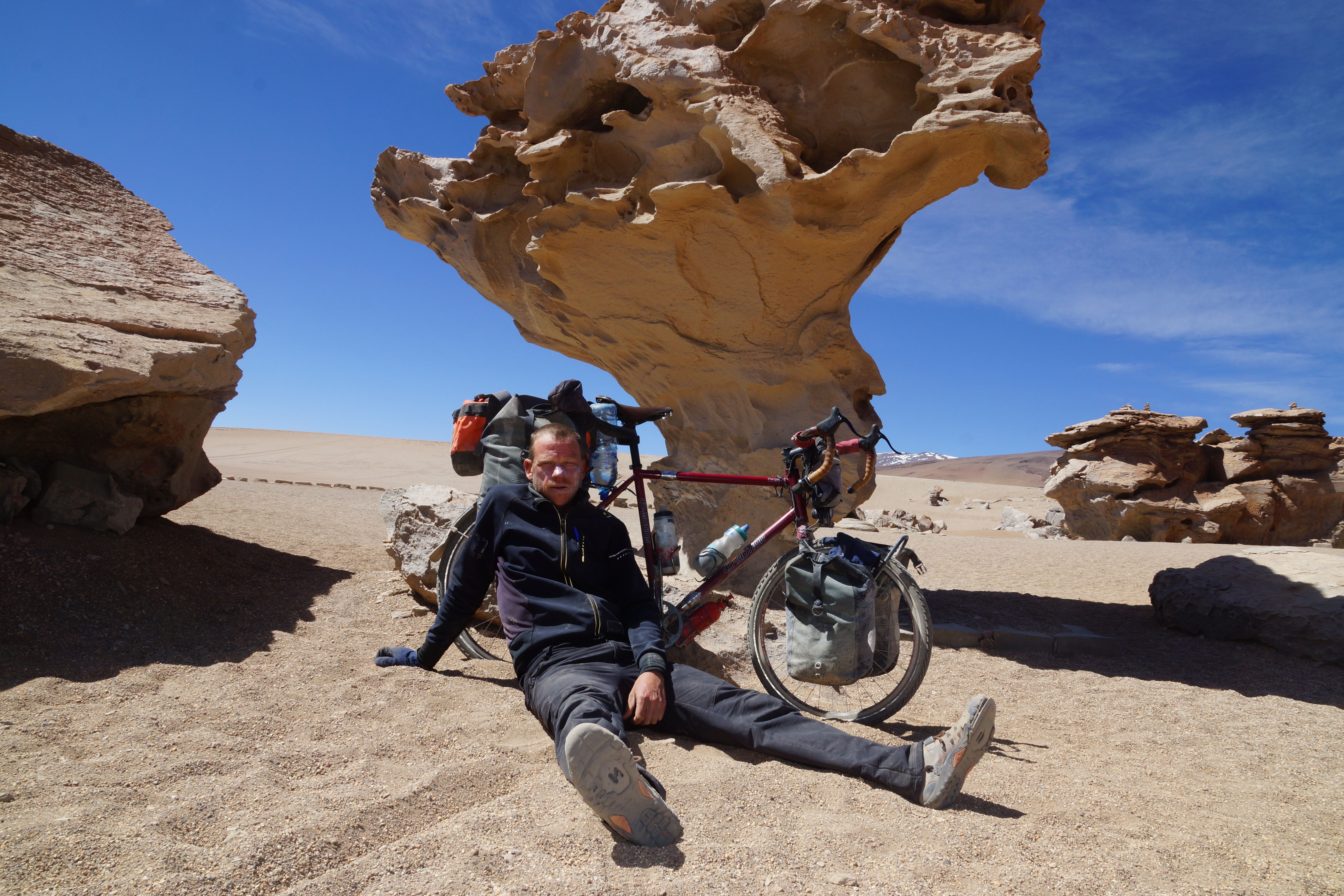 Day Five: Laguna Colorado to Laguna Chalviri: Great wind at my back again today so the biggest pass of the ride is not the nightmare it could easily have been. At the top of the pass the thermal geysers (‘Sol de Manana’) stink strongly of sulphur but the boiling mud pits are impressive. The 22 km down to Chalviri Lagoon is on good dirt but needs some attention and I almost come to grief a couple of times by getting too excited about the road when sand suddenly appears again there is a restaurant. The owners allow bikers to sleep on the floor. A real bonus is a thermal Pool with crystal clear hot water (drinkable by reports) across the road next to the Lagoon. Bliss soaking the weary bones and muscles in the soothing water at sun down looking out over the salt and the flamingos. Some 4WD drivers show up in the middle of the night and one snores like a drunken contented rhinoceros. Little sleep. A cycling shoe has blown out from all of the pushing through sand. Great. Pack buckle has broken. After a year on the road the equipment is now starting to fail. The Rohlofff gear hub is skipping on two gears 5 and 6, gears that would be really useful right now!). Am delighted about that one.