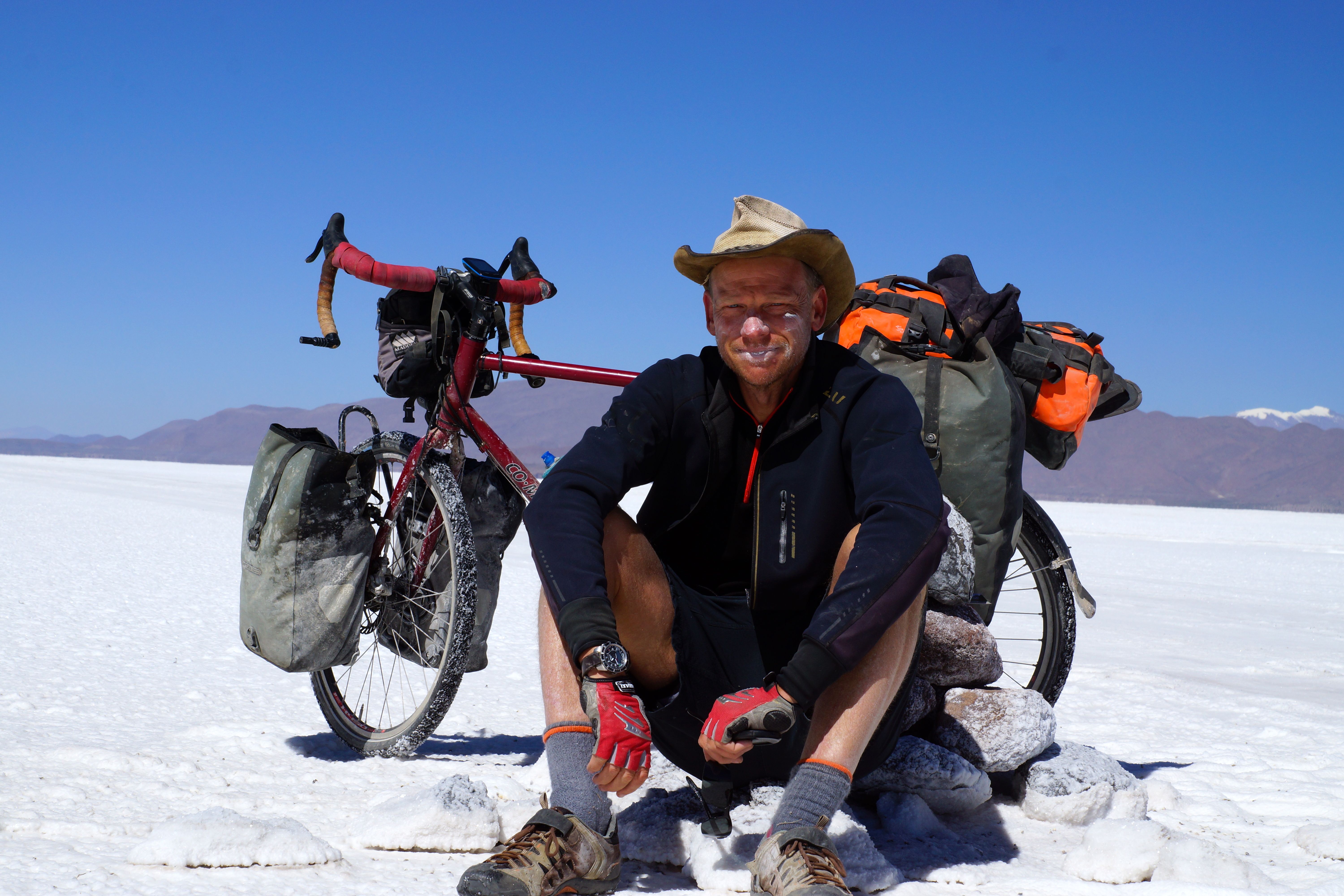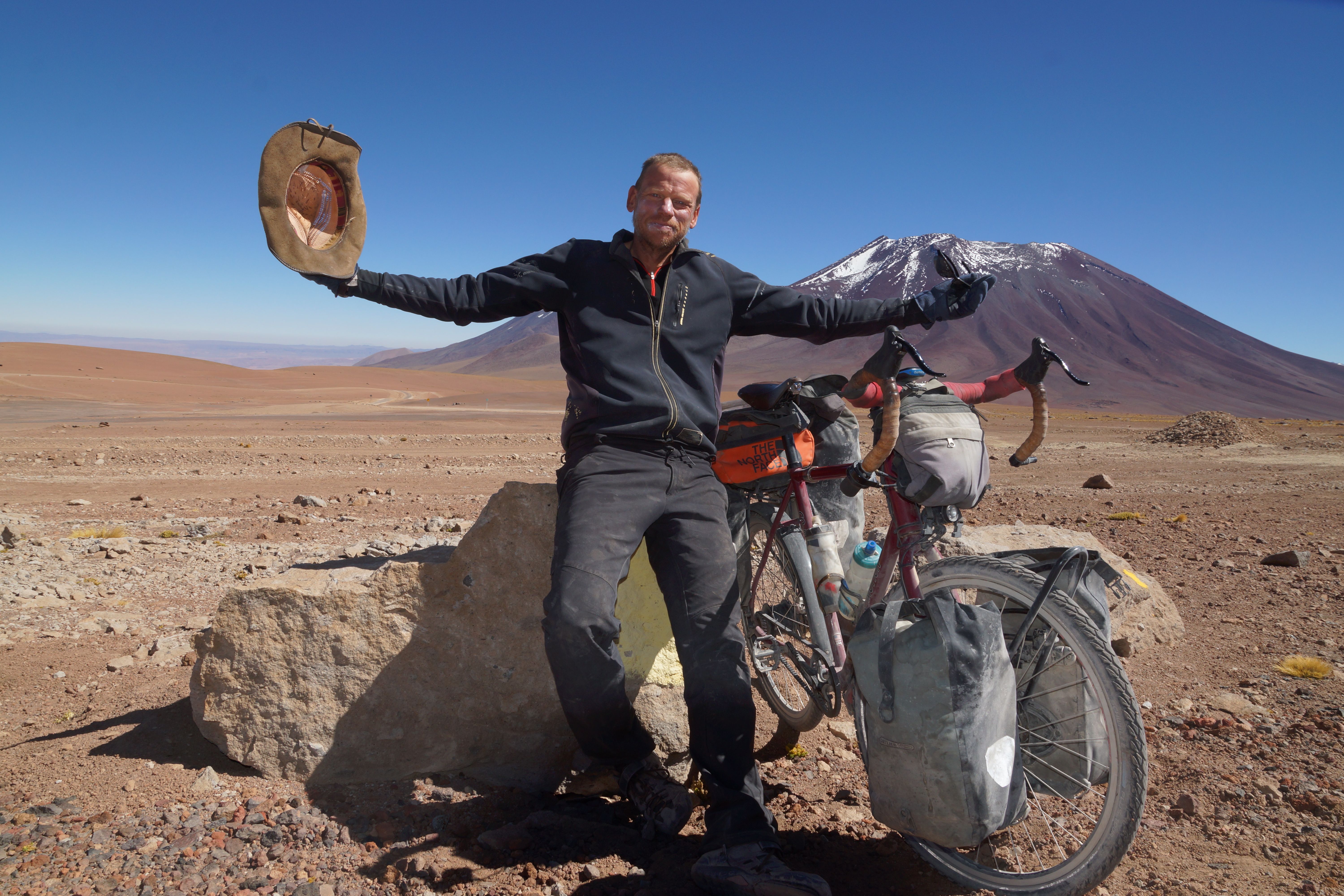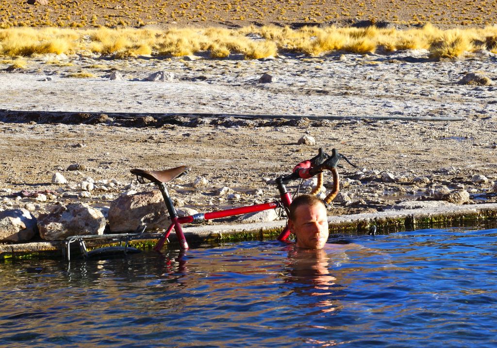 The magnificent roll of 41km down 2,000 alti-metres into the Atacama valley is pure unbridled joy so I let the pony have its head and we hurtle down hill at 50-60km/hour. I have ‘Whiskey in a Jar’ stuck in my head on the long plunge for some unknown reason. The heavily touristed oasis town (3,000 locals and 4,000 North Faced gringos) of San Pedro de Atacama awaits along with its beer, pizza, cappuccinos and lovely hostels. On arrival I discover that during the three weeks that I have been out of radio comms on the track in Bolivia, there have been fraudulent attacks on all three of my credit/debt cards so all are blocked or cancelled. Am in SP de Atacama and can’t afford an ice cream! Bliss! Brother to the rescue with a Western Union funds transfer from Australia. Cheers! I spurge on a North Face Polartec beanie (for $30!) which is ‘Asphalt grey’; a good indicator me thinks of the make up of the roads that I will be sticking to for a little while to come. Thank you Bolivia, for one of the most amazing rides and scenery displays that this boy will probably ever encounter.