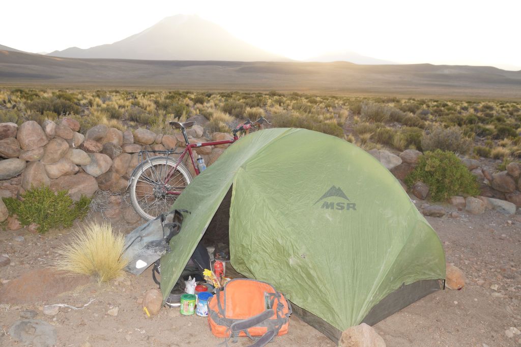 Day One: San Juan to top of Pass: Morning is spent cruising across the ‘pampas’ mud/sand flats and then up a pass that proves rocky and steep in places so some pushing involved for 10km in the afternoon. Found a wind-break two km beyond the top of the pass so camped there for a surprisingly mild night with thankfully no wind.