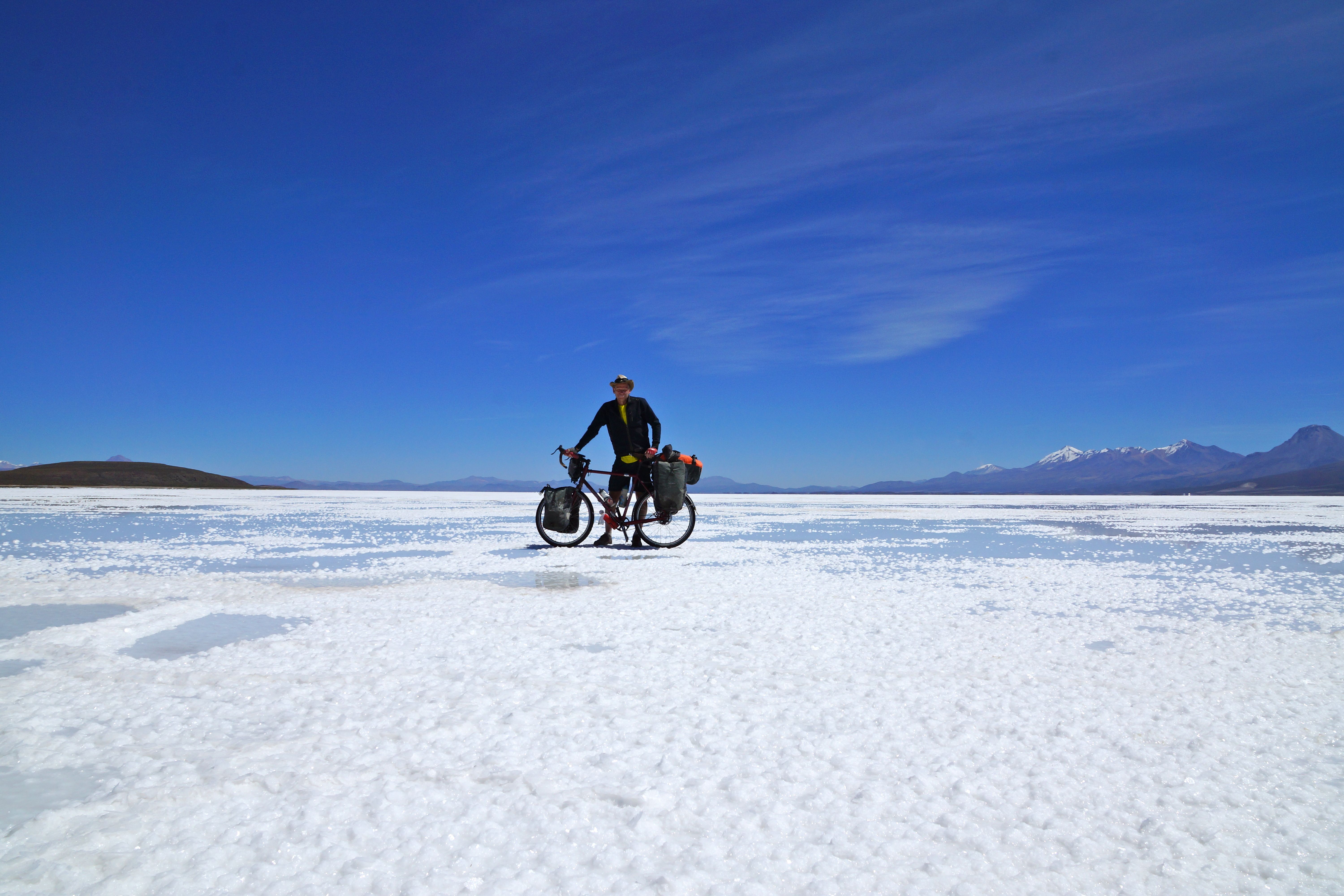 Bolivians continue to be a very pleasant and relaxed people. Resplendent in their delicately balanced bowler hats, the ladies seem to always have a smile, a laugh and a greeting. In Coipasa village on the island in the middle of the Salar, a lady that runs a tiny shop, on seeing my wet salty feet, decides to give me a bowl of warm water and then washed my feet! Didn’t expect that one. She took my only pair of soggy shoes somewhere to dry them and offers a room for the night. She’s 55 but I swear she could have said she was 70 and I wouldn’t have batted an eyelid. Next day is an epic day’s ride of 82km started with taking a ‘short cut’ across the north of the island. The reported one foot of lagoon waters on the eastern side of the ‘island’ means that there was no choice but to take this circuitous route back across the north of the island and then cut south. My ‘short cut’ quickly turns to nightmarish scramble through scrub and rocks for four km and managed to knock and scratch the legs around a bit; all unnecessarily.