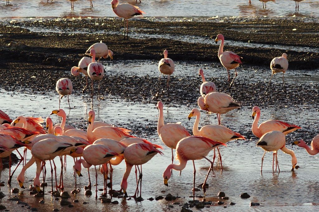 Day Two: Top of Pass to Laguna Hedionda: Some fairly tricky rocky and sandy tracks for seven km to start the day off then down a lovely eight km of excellent maintained hard packed dirt road. Back onto the rough stuff for the afternoon and multiple 4WD tracks fan out across the way making navigation interesting in places. Am getting used to the idea of just picking tracks that head in the right general direction and feeling the way around the largest of the volcanoes, of which there are many dotting the region. There are many flamingos in Hedionda Lagoon before dusk as I arrive (refer photos). I’m already sun burned from the reflection of the harsh light and dry wind on the Salars.