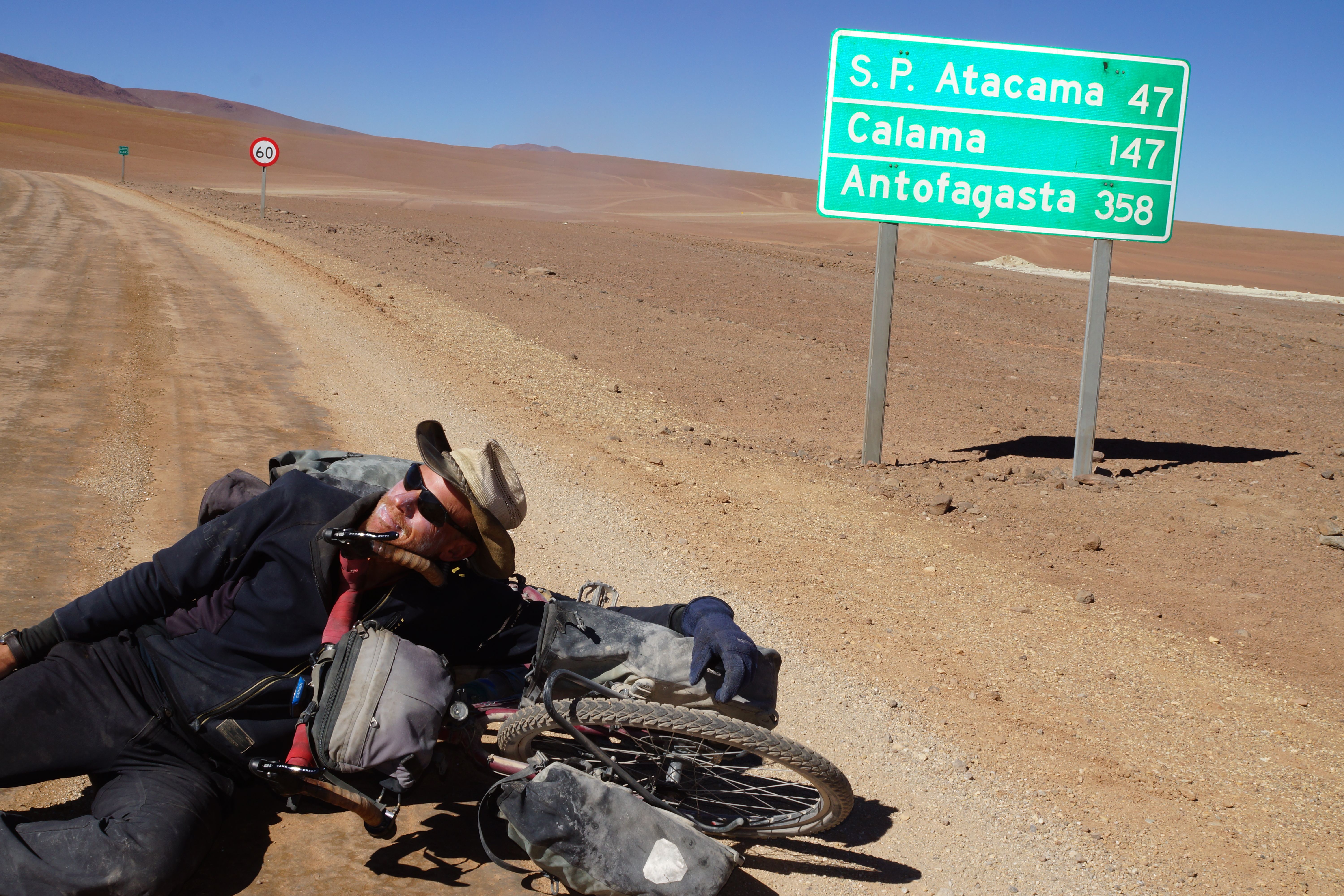 Day Seven: Laguna Verde to San Pedro de Atacama: There’s only 7km slightly up hill on good dirt road to the Bolivian immigration post then another 5km to the top of the rise and the westerly turn towards San Pedro de Atacama. I fear the, “do you have the little slip of paper ploy from the official but he mentions it and then gives up. I must still look like a mercy case. I understood from some that the immigration would charge you 21B to leave but this guy doesn’t bother. I have to ask him and he says that it sometimes applies but for you, no. Mercy be! I do look that bad! Just beyond the Bolivian frontier, bike, Buff3y and the new-found lovely asphalt enjoy a touching group hug moment (refer photo).