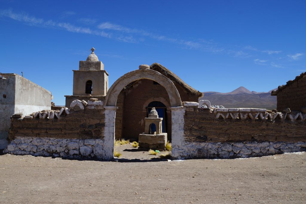 I then turn south once more onto isolated dirt road and tracks then back on the asphalt SW to Curahuara and the run to Sajama, just before the western Chilean border crossing. Sajama is a very basic village in the shadow of the huge volcano from which it get’s its name. On the dirt road near Corocoro I had the treat of witnessing the enthralling spectacle of a bolting donkey dragging a cart-wheeling and rapidly disintegrating mountain bike across the plain. Two young boys, one of whom had benn inspired enough to tether his wayward donkey to a bicycle, were chasing it as it made its break for freedom, dragging the bicycle with it. The donkey was winning very easily so beast and machine passed me at a rate of knots with the bike at the end of the rope taking an utter pounding, spinning into the air and crashed back to earth again and again. Finally the rope snapped and the poor bicycle lay broken and twisted on the ground. Finally I had the chance to play ‘Bicycle Repair Man’ and miraculously, we managed to put the poor bike back into some sort of working order. A good advertisement for the strength of the ‘Datsun’ bike frame as it somehow held together through this punishment. Perhaps all bike frames should be given the donkey strength test. The repair got the boys another 5km home anyway.
