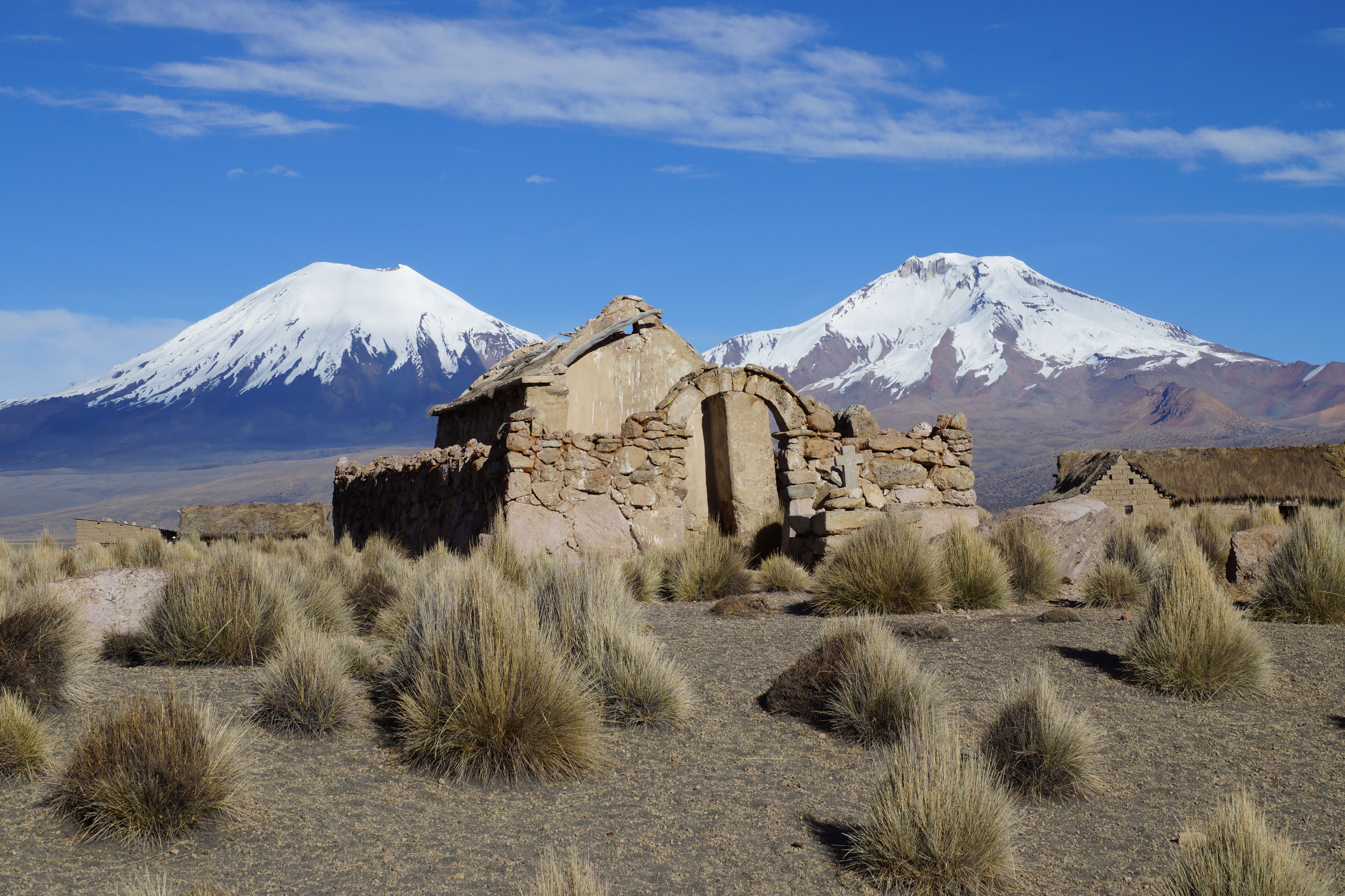 Six km north of the village of Sajama there is a hot spring pool which is a wonderful treat. A great opportunity to soak the legs, gaze at the volcanoes and tighten up one’s ‘individual non-synchronized water ballet’ maneuvers (refer video). South of Sajama the next morning the clear weather reveals the surrounding peaks in all of their collective splendor. These volcanoes form a semi-circle around Sajama village with Sajama itself, the most formidable peak. Across the way are twin peaks (refer photos) and closer to the Chilean border, a huge exploded remnant cone.