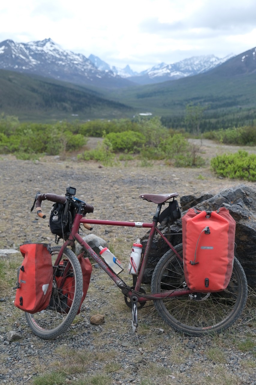 The lovely Co-Motion near the Tombstone Mountain campsite about one day’s ride (75km) from the bottom of the highway.