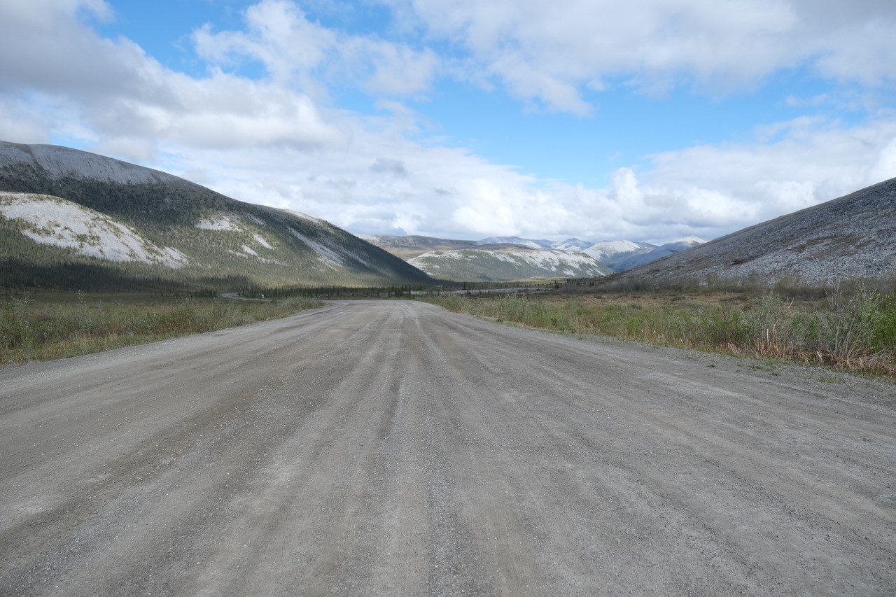 The beautiful road through the shallow valley on the way up to the final pass of the Dempster.