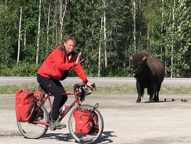 Running the gauntlet of a wild and dangerous bison near the Liard Hot Springs.