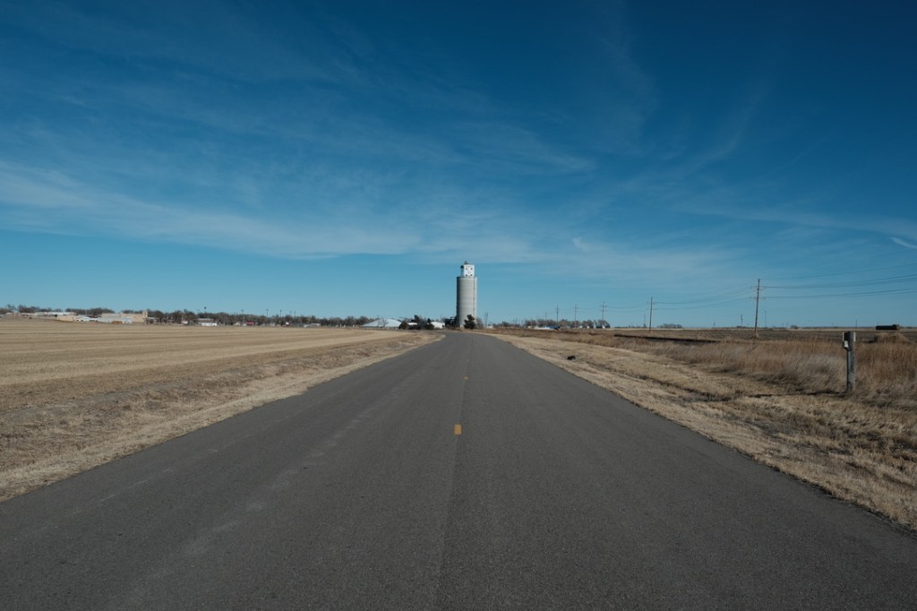 The great cathedrals of the Santa Fe trail, the huge wheat silos out here on the high plains. You can see looming in the distance announcing the next little town.