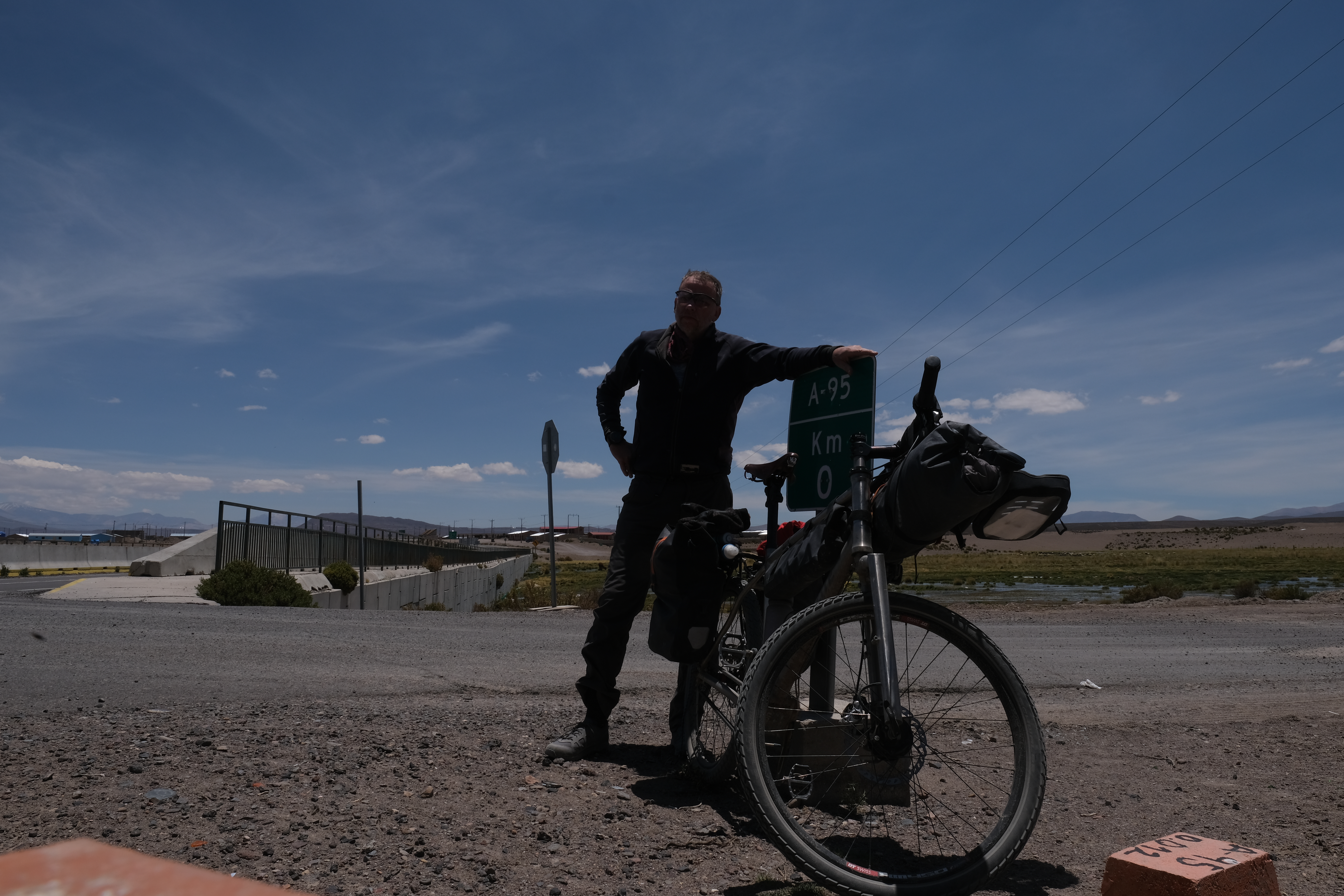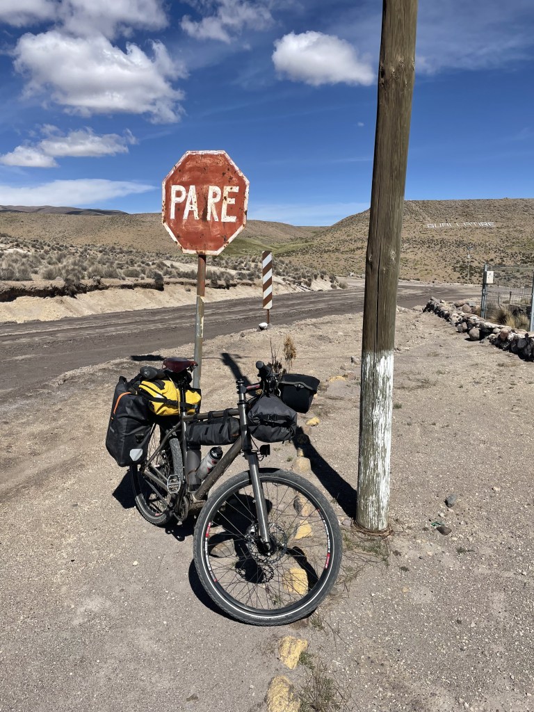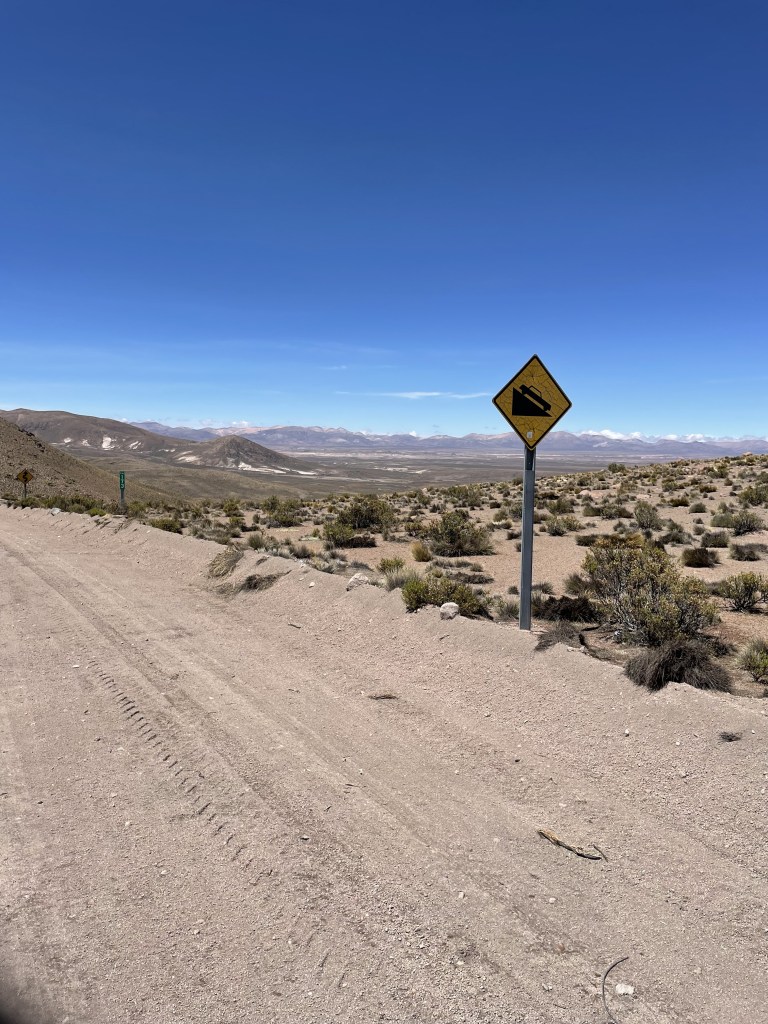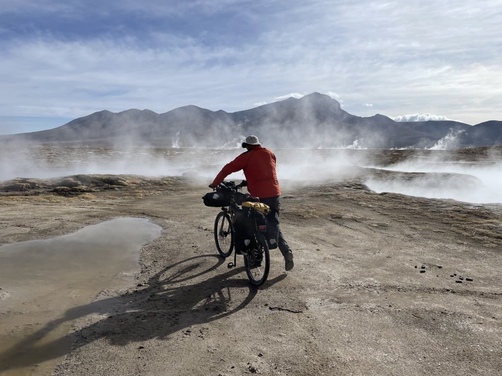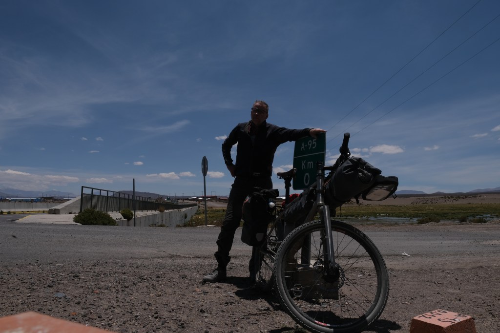 The ‘Ruta Andina‘ starts in far northern Chile at the Peruvian border. It heads southwards skirting along the Chilean side of the border with Bolivia, at the elevation of the aliplano (3,500 metres) towards the Atacama desert. Along the way it takes a keen young adventure cyclist through some magnificent scenery dotted with lines of volcanoes, geysers, hot springs and dirt, lots of dirt.