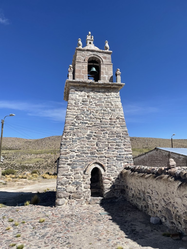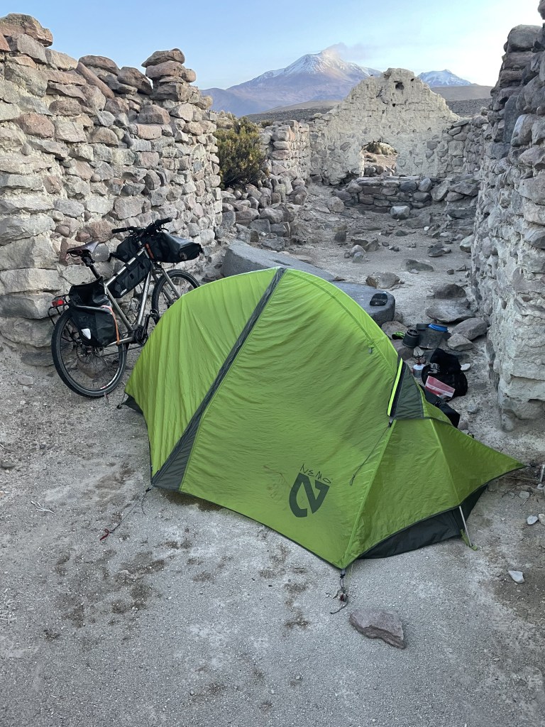 Churning over the washboards and sinking into the sand that passes for road in these parts of South America, for the first time in a long time. Testing the camping set up in a long abandoned stone mill house replete with the grinding stones, which sits not far off the smoldering volcano Guallatiri. This camp site is just across from a free flowing river so is the perfect camping spot.